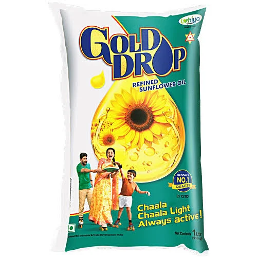 The Gold Drop Refined Sunflower Oil in the 1-liter pouch is a popular light cooking oil, particularly favored in Southern India for its high purity and nutritional fortification. It is designed to be a “very light” oil that doesn’t overpower the natural flavor of ingredients.